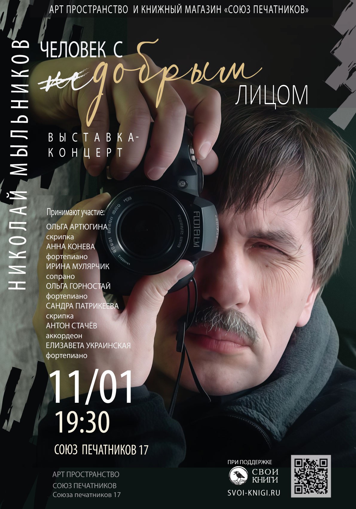 Друзья, 11 января в 19.30 большой концерт ознаменует открытие выставки фотографа Николая Мыльникова (1955–2025) «Человек с недобрым лицом».