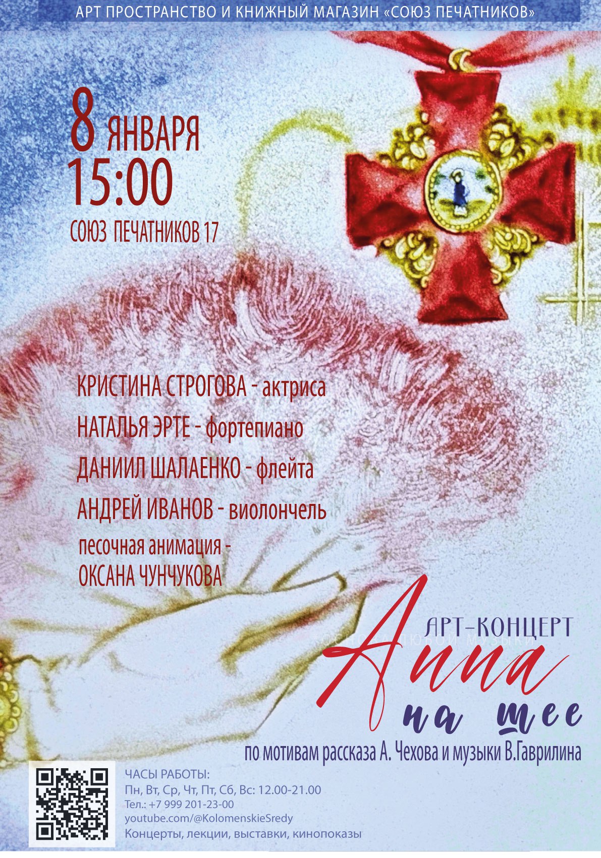 Друзья, ждем 8 января в 15.00 на арт-концерт «Анна на шее», созданный по мотивам одноименного рассказа Чехова и музыки Валерия Гаврилина к фильму-балету «Анюта». Перед нами развернется синтез музыки, литературного текста и песочной анимации.